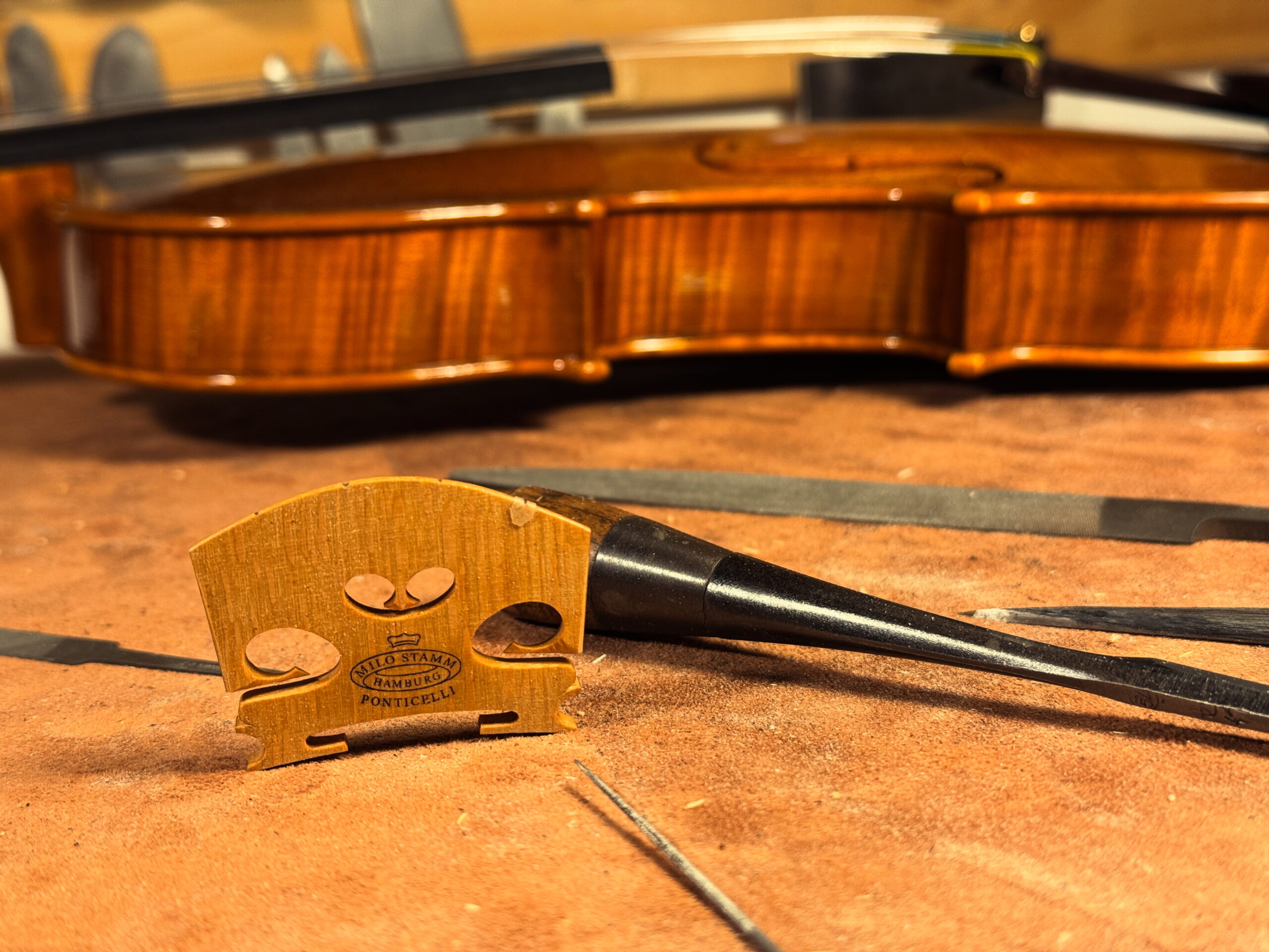Sakamoto Violinsでは、表板のアーチに合わせて駒を削り出し、左右のバランスを整えながら精密にフィッティングします。