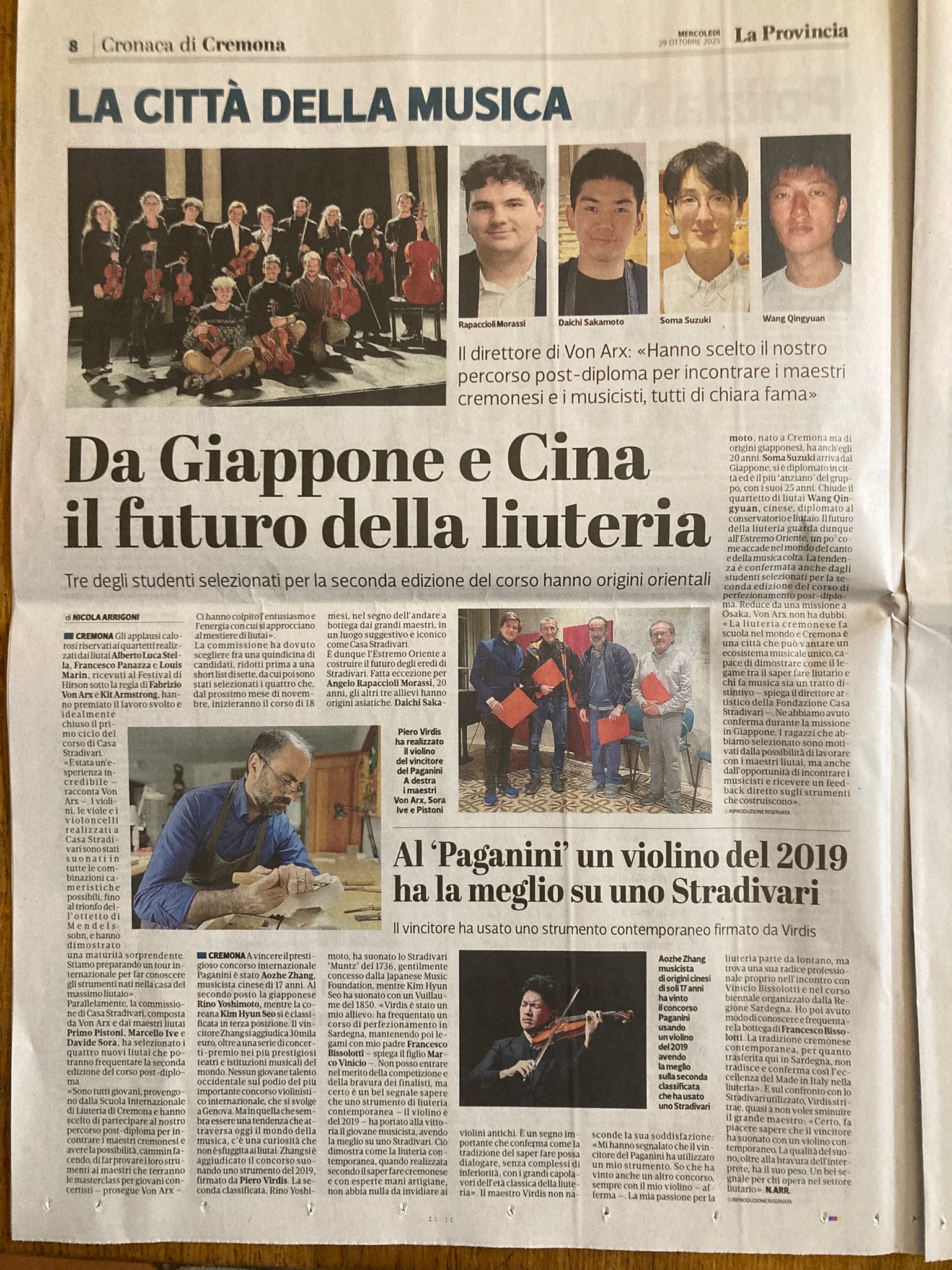 先日次男の大智が、カーザ ストラディヴァリウス財団が主催する才能ある若い職人を支援するという使命を掲げ、ヴァイオリン博物館およびクレモナ市と協力し、ユネスコ無形文化遺産に登録されている「クレモナの伝統的なヴァイオリン製作ノウハウの保護計画」に基づく2025~2027年上級ヴァイオリン製作コースの選別募集で15人の応募の中から4人選ばれた中の一人に選出されました。このコースは、内部鋳型をベースとしたクレモナの伝統的な製法に基づき、四重奏用のクラシック弦楽器を製作するためのトレーニングプログラムです。